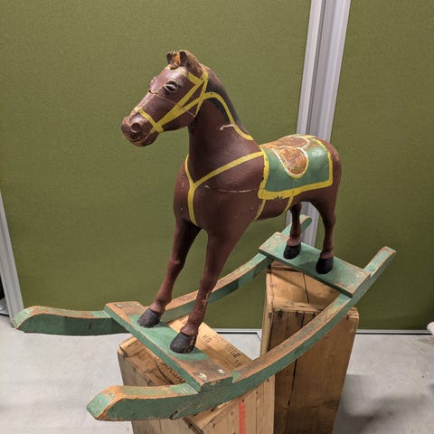 Arvet en flott gyngehest utskåret av tre som var ganske dyr i sin tid. Alle elsker den, men vi har ikke plassen den trenger for å skinne.