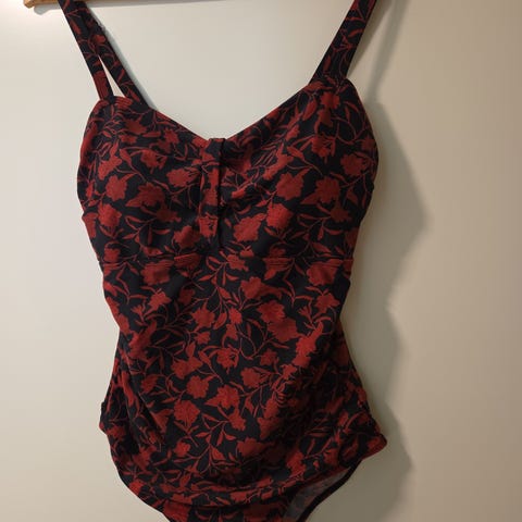 Retro ubrukt badedrakt. Pinupstyle. Kjøpt fra ester Williams nettside i usa for ca 20 år siden, trygla og ba om at de skulle sende til Norge som de vanligvis ikke gjorde. Den kom frem men var for stor så jeg pakket den vekk og gjemte den helt.