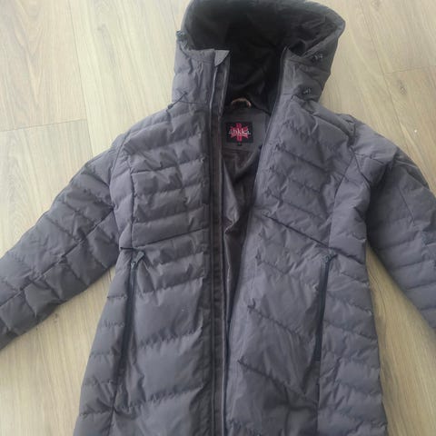 God, varm og fin parkas med glidelås og knepping foran. Store lommer med knepping foran, brystlomme med glidelås og innerlomme med glidelås. Stramming i midjen. Stramming på hetten og pelsen på hetten kan tas av. Jakken er merket med str. 42/44, men jeg vil si den er en str. 40 (muligens 42) Jakken er lite og pent brukt.