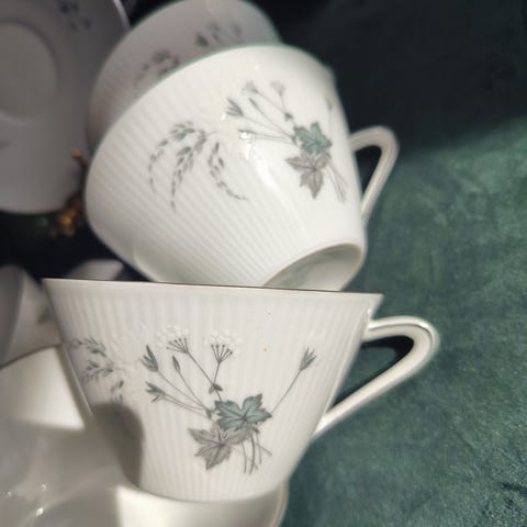 Veldig godt stand. Totalt 6 sett ( kopp og asjett). 200 kr per sett. Kan sende med post nord for 69 kr extra. Tallerkener selges også. Sukker skål 200 kr. Pakker veldig godt.