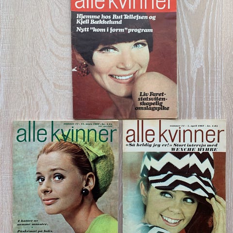 Selger gamle blader fra 1960 - tallet. Tre «Alle Kvinner» 1964, 1965 og 1967. I tillegg ett «Kvinner og Klær» fra 1966.