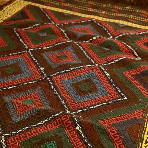 Selger dette vakre flatvevde chenille/ ull-teppet for ca 1/3 av opprinnelig pris. Som nytt. Lettstelt med flat rugg.