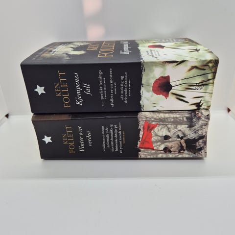 Selger 5 bøker av Ken Follett, britisk spennings forfatter i særklasse. Bøkene er pent behandlet, fleste lest en gang eller tre. Omslag og innbinding i rimelig god stand, dette er bøker kjøpt på 70 tallet, noen i løpet av 80 tallet også.