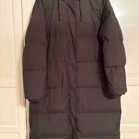Lang dunjakke. Fruen er 165 og den rekker nesten ned til ankelen. Pent brukt. Ikke vasket. Str L. Nypris ca 2000kr.