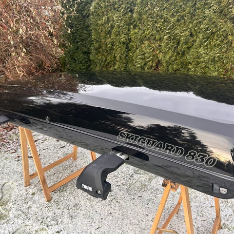 Skiguard 860 takboks i sort farge, designet for montering på takstativ på biler. Takboksen er laget av slitesterkt materiale og har et aerodynamisk design for redusert vindmotstand. Passer for transport av ski og annet sportsutstyr.