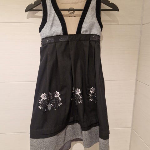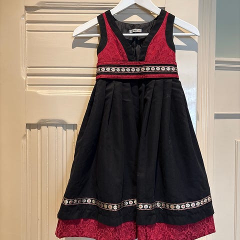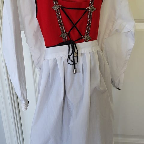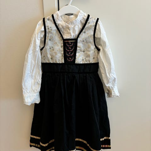 Exit festdrakt til jente selges. Str. 104. Skjorte følger ikke med. Knapper i ryggen, borrelås på beltet. Kan brukes med eller uten forkle.