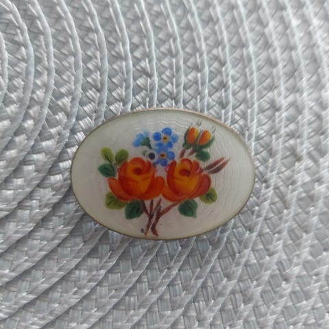B 5cm, vekt 25 gr. Norsk Filigranfabrikk Oslo 🙂 Det er er kant mellom den hvite og sorte kanten ytterst og det hvite. Den ser ut som bladgull og det samme med fuglen i midten.