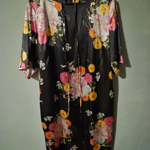 Herlig kjole fra Koko norway. Kjolen er løs i fasongen og litt stor i størrelsen. Fin passform, lomme på hver side. Vide armer med strikk nederst. Brukt en gang.