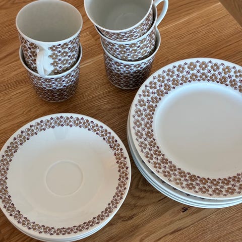 Pent brukt sett med to krus, to espressokopper og to frokosttallerken. Uten bruksmerker, skader eller riper. Tåler oppvaskmaskin og mikrobølgeovn. Kan hentes i Oslo eller sendes på kjøpers regning, jeg pakker godt.