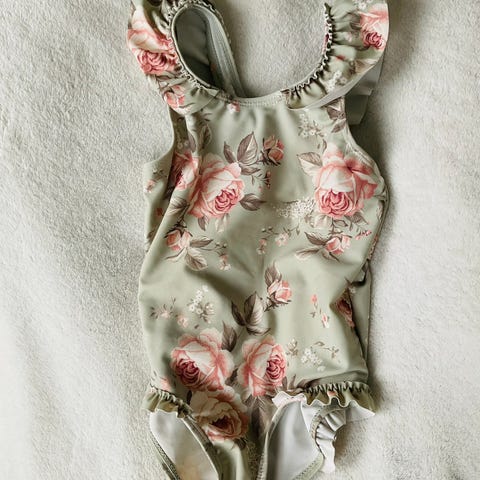 Badedrakter er i størrelse 86/92 og uv drakt i størrelse 86. Søte små deltaljer som sløyfer, rysjer, blomster motiv og fisk motiv. Hentes eller sendes