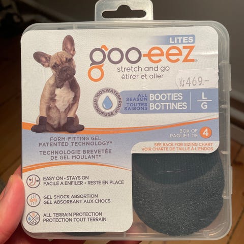 Pent brukt Goo-eez hundesko / potesokker selges. Disse er kjøpt brukt, men kun prøvd på. Applikator/boks medfølger. Disse er veldig greie å bruke, men ble litt for store for min chihuahua. Nypris 480 kr, selges for 200kr.