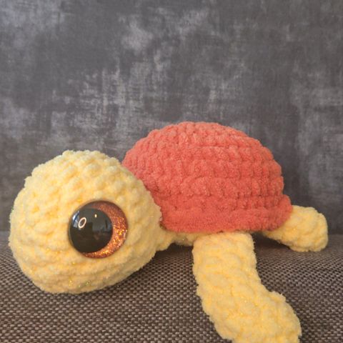 Heklet skilpadde i mykt polyester garn. Alle fargene glitrer.