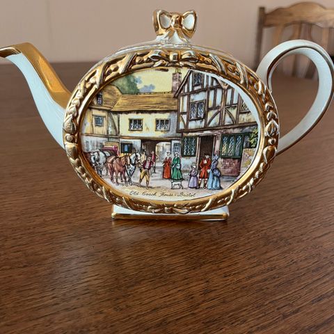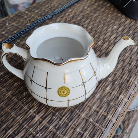 Utrolig flott te kannen med blomster motiv og gull.
