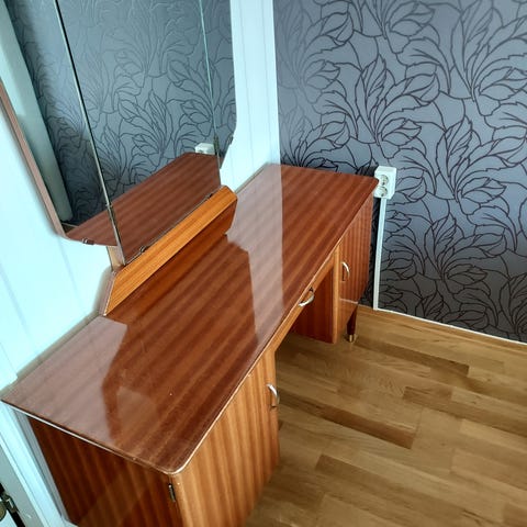 Gammel skjenk i flammebjørk, trenger litt omsorg. Kan leveres mellom Oslo og Bodø.