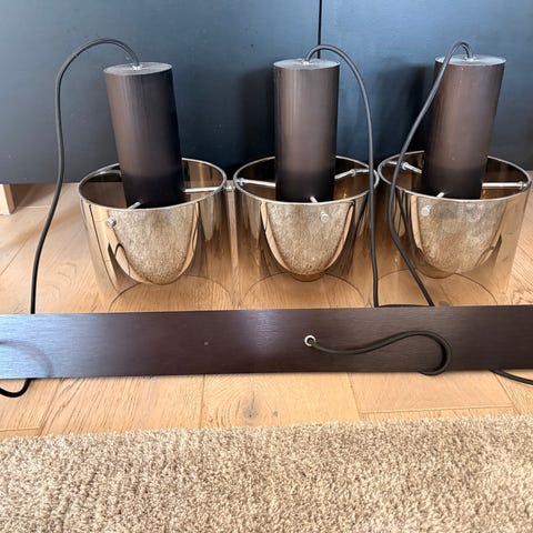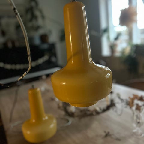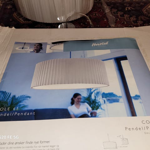 Lampen har detaljert i skinnende krom. Skjermen består av to lag akrylolater med et dekorativt mønster.