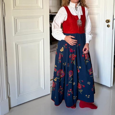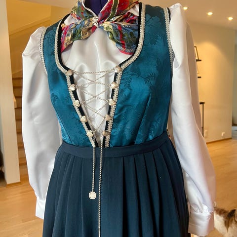 En gammel lokalsydd mørkeblå bunad fra Gudbrandsdalen med broderi i farger som ligner de som ble brukt på en av de eldste originale grønne/sorte utgavene av drakten. Denne er det ikke mange som har maken til.