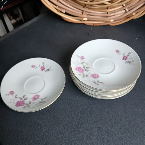 Tre asjetter, 17 cm i dm og fire kaffefat 14 cm i dm selges. Bittelite hakk på den ene asjetten. Prisen er pr. stykk.