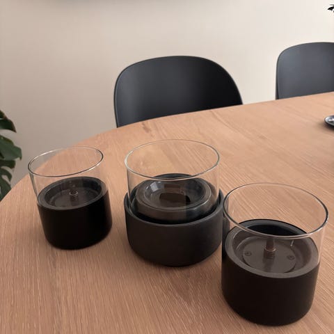 Sett med to bordlykter i vinrød farge, og flaske med TenderFlame fuel.