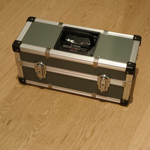Selger en eldre foto-koffert i fin stand. Med skulder-stropp. Det er noen malings-flekker som ikke er forsøkt vasket bort, og nøkkel mangler. Skumgummi i fin stand, men selvfølgelig kuttet opp for å passe gammelt innhold. Interiør i tre.
