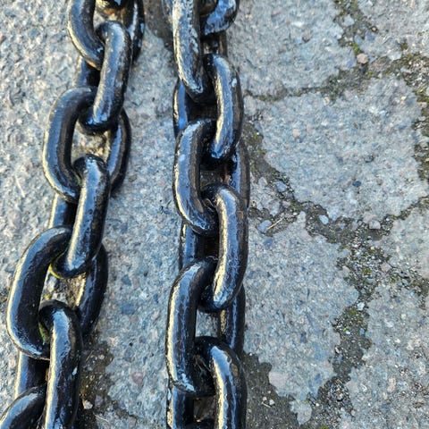 Grov kjetting ca 20cm løkkestørrelse ca 30m selges sammlet eller delt tlf 90750221. Det er også ca 6m av den groveste kjettingen på bilde. med løkke størelse 34Lx20b