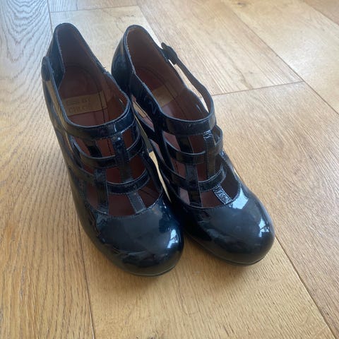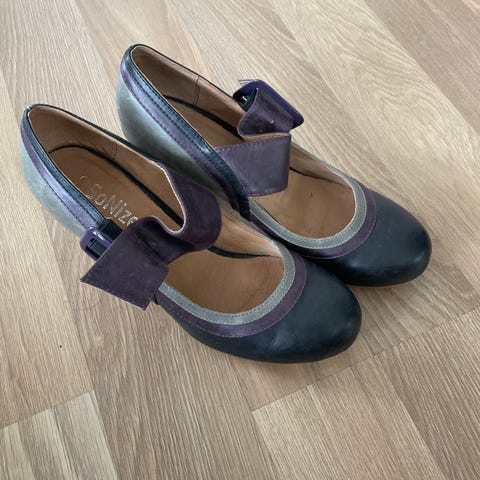 Kjempefine Chicas pumps i mørkebrun med grønne og gull detaljer selges. Hele og pene, ikke skinn. Str 37