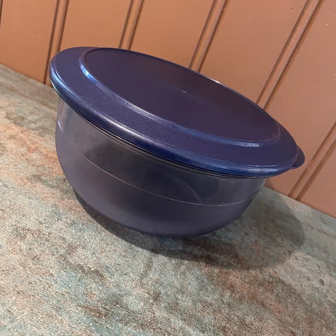 Tupperware skål, blank med blått lokk. Ø 32 h 7