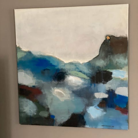 Mixed media on glass. Kjøpt hos Galleri Ramfjord 2019. Glasset og rammen er en del av verket.