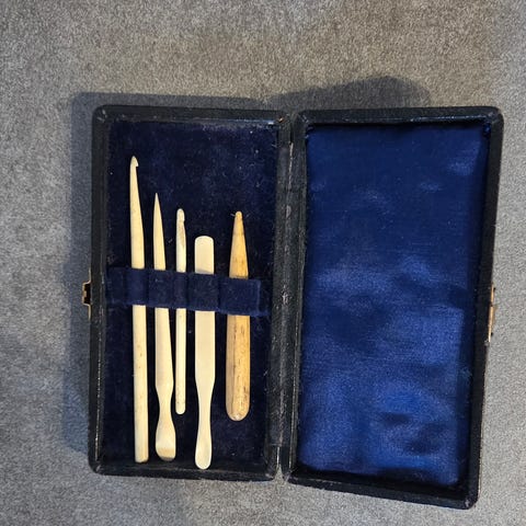 Sy verktøy fra Fiskars med bruksanvisning. Mangler pinsett, maskeopptaker( jeg har brukt heklenål i stedet) og forstørrelsesglass. Derav pris.