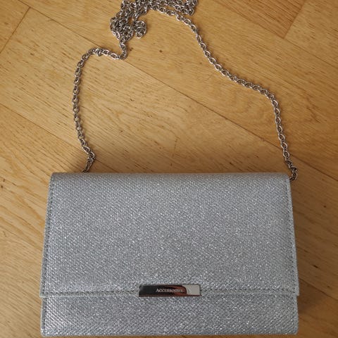 Veldig elegant clutch fra Accessorize,med langt veske kjede for å endre lett i enn skulderveske😊. Vesken er lett og med skinnende materiale .Vesken er litt brukt og er i god stand.Har du spørsmål,bare ta kontakt med meg🙂
