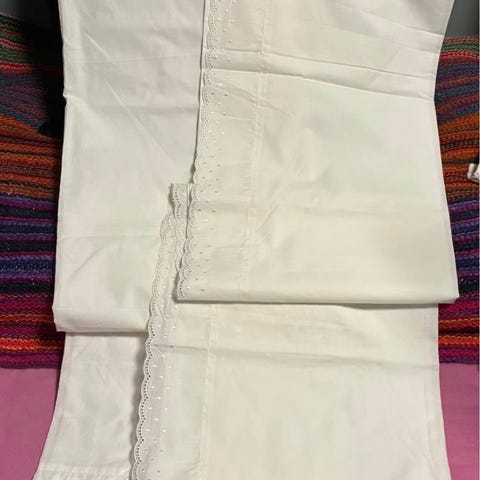 1 fag (2 stk) hvite (varm farge) gardiner med påsydd mønster i hvitt til oppheng stang med sølvringer. Den ene gardinen har en stivere "overkant" enn den andre, av