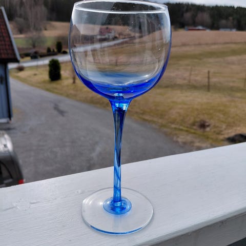 Jeg rydder i forbindelse med flytting, og selger 4 nydelige vinglass med stett i blått kunstglass fra Hadeland Glassverk.