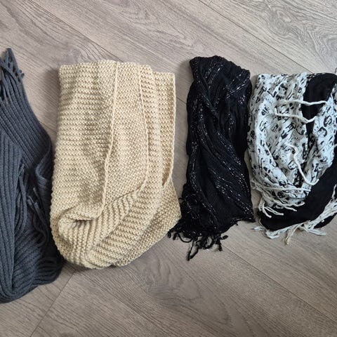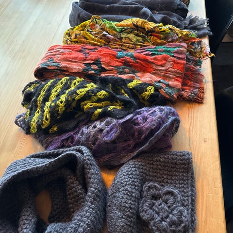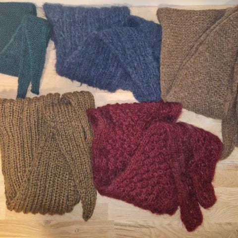 Alle 3: grønn poncho, lilla sjal og hvitt, heklet sjal.