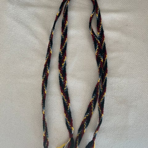 Håndlaget i 100% norsk ull fra Rauma. 3-tråds strikkegarn. Ca 100 cm lange pluss dusker, ca. 2 cm i bredde. Disse her er flammet med 20 tråd, men jeg kan flamme en annen type hosebånd etter ønske (med mer tråd, i andre farger, med forskjellige mønster, dusker osv.). Kan sendes.