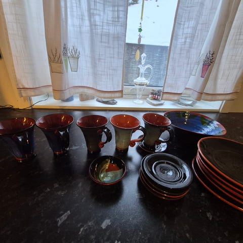 Siden det er håndlaget er det flotte varianter og forskjeller på alle kaffefat og krusene.