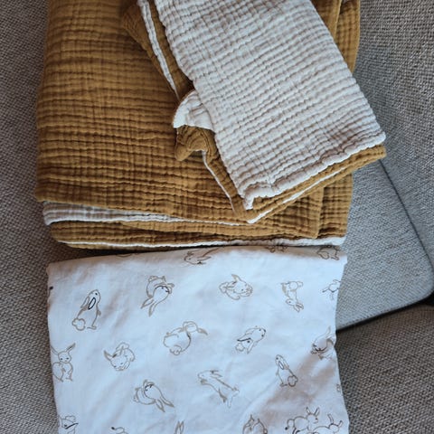 Sengesett til vugge eller vogn, med laken, dynetrekk og putetrekk. Økologisk bomull.