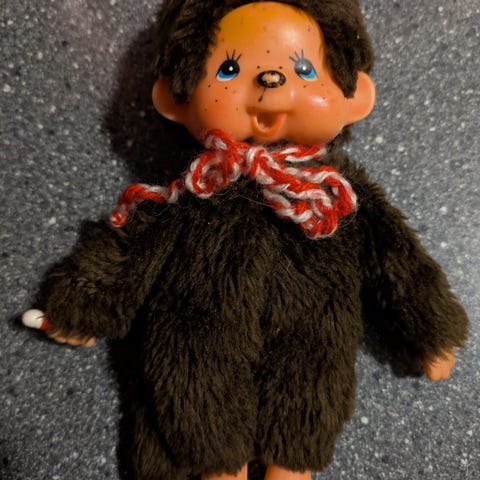 Vintage Monchhichi fra 70 tallet selges. 18 cm lang