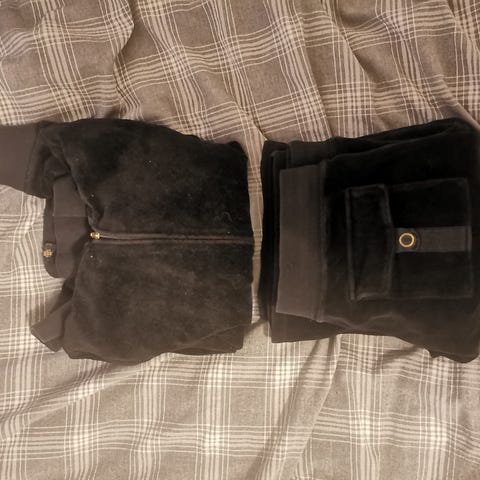 Selger juicy couture sett til 500 kroner. Lite brukt ettersom at fargen ikke falt helt i smak. Glidelåsen på jakke mangler, blitt borte i vask. Ellers er det slik som det skal, ingen synlige skader (utenom at man ikke får tatt igjen jakken da glidelåsen mangler).