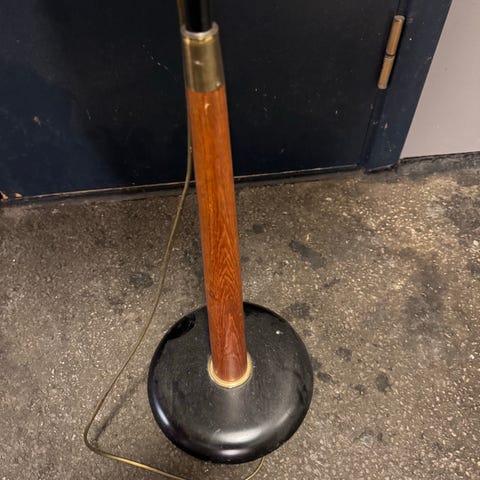 Pen lampe med teakdetalj på foten. Tung i bunnplaten og står derfor meget stabilt.