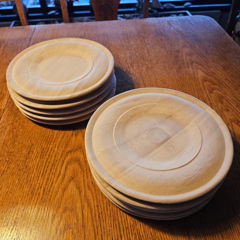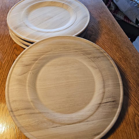 Trefat, et med 3 ben under, diameter 25 cm. Kr 70,-. Fat nr to, diameter 23 cm. Kr 50,-.