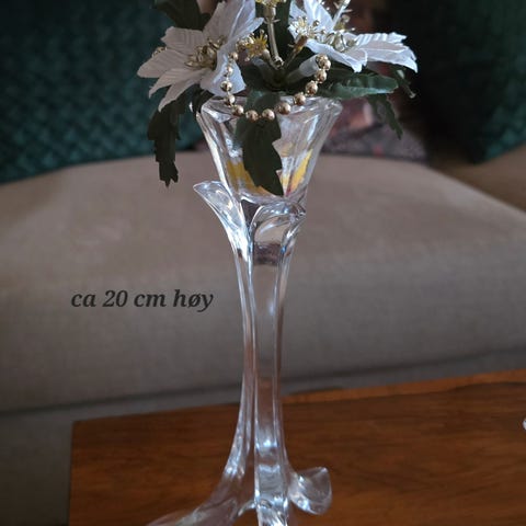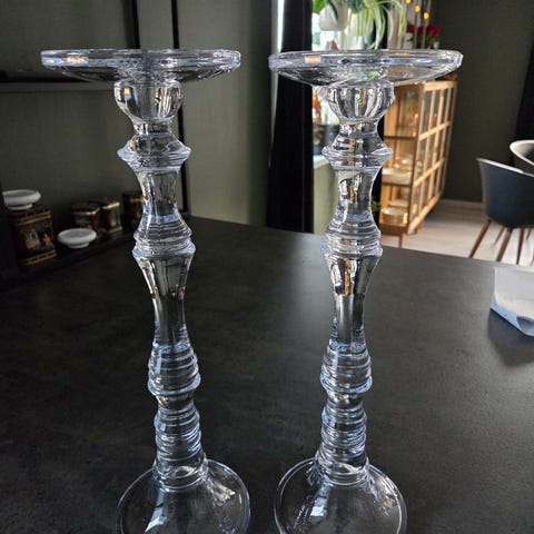 Selger ulike lysestaker. Ett sett (to stk) i kobber, en i svart stett med glass og en større glasskolbe med håndtak. Se vedlegg.