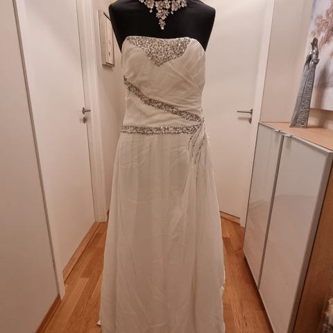 Nydelig hvit kjole i str. 38. Den trenger å sy nederst for å passe til riktig lengde. Kan sendes