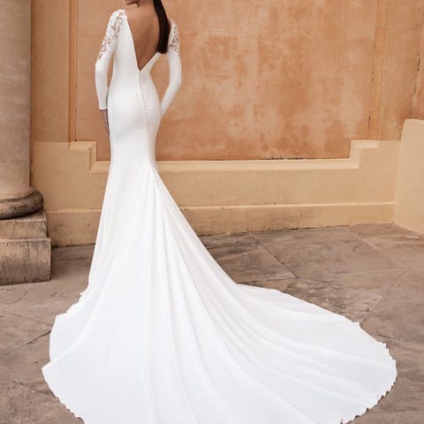 Pronovias Tanay. Opprinnelig kjøpt i XL og sydd inn til M/L. Dermed er ryggen løftet noe og slepet er fjernet.