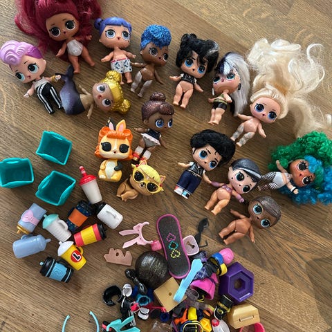 Jentungen selger LoL dukkene sine. 9 dukker og 2 dyr, pluss to hoder man kan bytte med. Masse utstyr ved siden av. Se bilder.