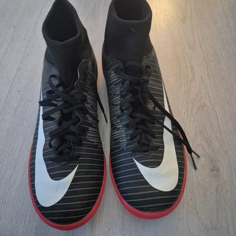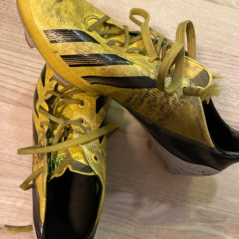 Adidas fotballsko for innendørs bruk i gul og svart farge. Størrelse 41 1/3, laget i Indonesia. Skoene har gummisåle egnet for innendørs underlag.