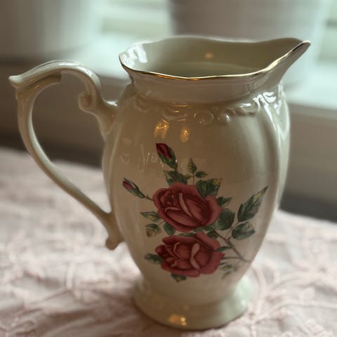 Strøken mugge med blomstermotiv.