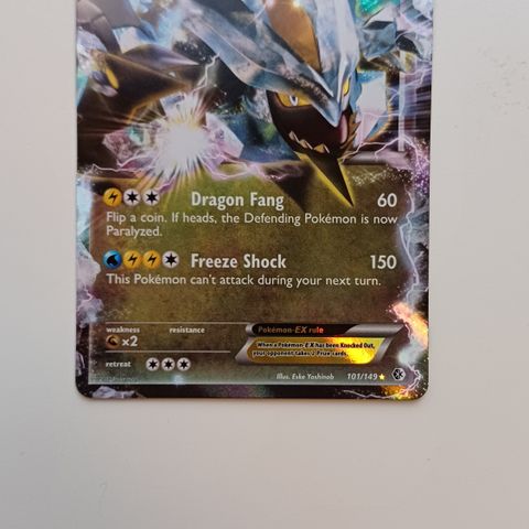 Selger et Pokemon-kort: Black Kyurem (Plasma Storm) EX, nummer 95 i Plasma Storm-serien fra 2017. Kortet er i god stand, og har blitt oppbevart i beskyttende sleeve, som følger med på kjøpet. Se bilder for nærmere detaljer angående tilstanden. Kan sendes med Fiks ferdig eller hentes i Oslo.