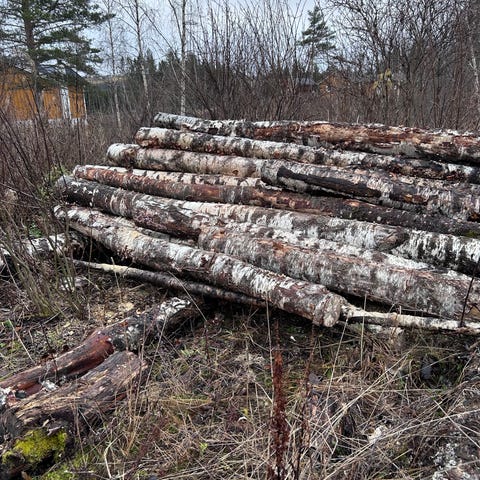 Kappet på 30cm og kløyvd i profesjonell vedmaskin som sorterer ut bøss og fliser.
