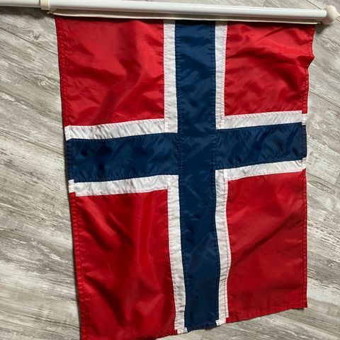 Selger norsk flagg med stang. Str på flagget 56 cm x 75 cm, stang 133 cm i lengden. Nb! Litt slitt på toppen, se bilder