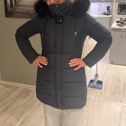 - Svea mørk blå dunjakke med kunstig pelskrage, lang type , brukt kun noen få ganger , str. XS , justerbar hette og midje , kan åpnes oppe og nede , 2200,-