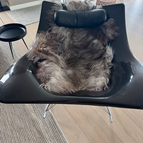 Brukt Stingray gyngestol fra Fredericia Furniture, designet av Thomas Pedersen selges. Det er en liten sprekk i bunn sammen med svak rød strek. Se bilde. Det er lite synlig, og ikke synlig når man har teppe/sauskinnsteppe.